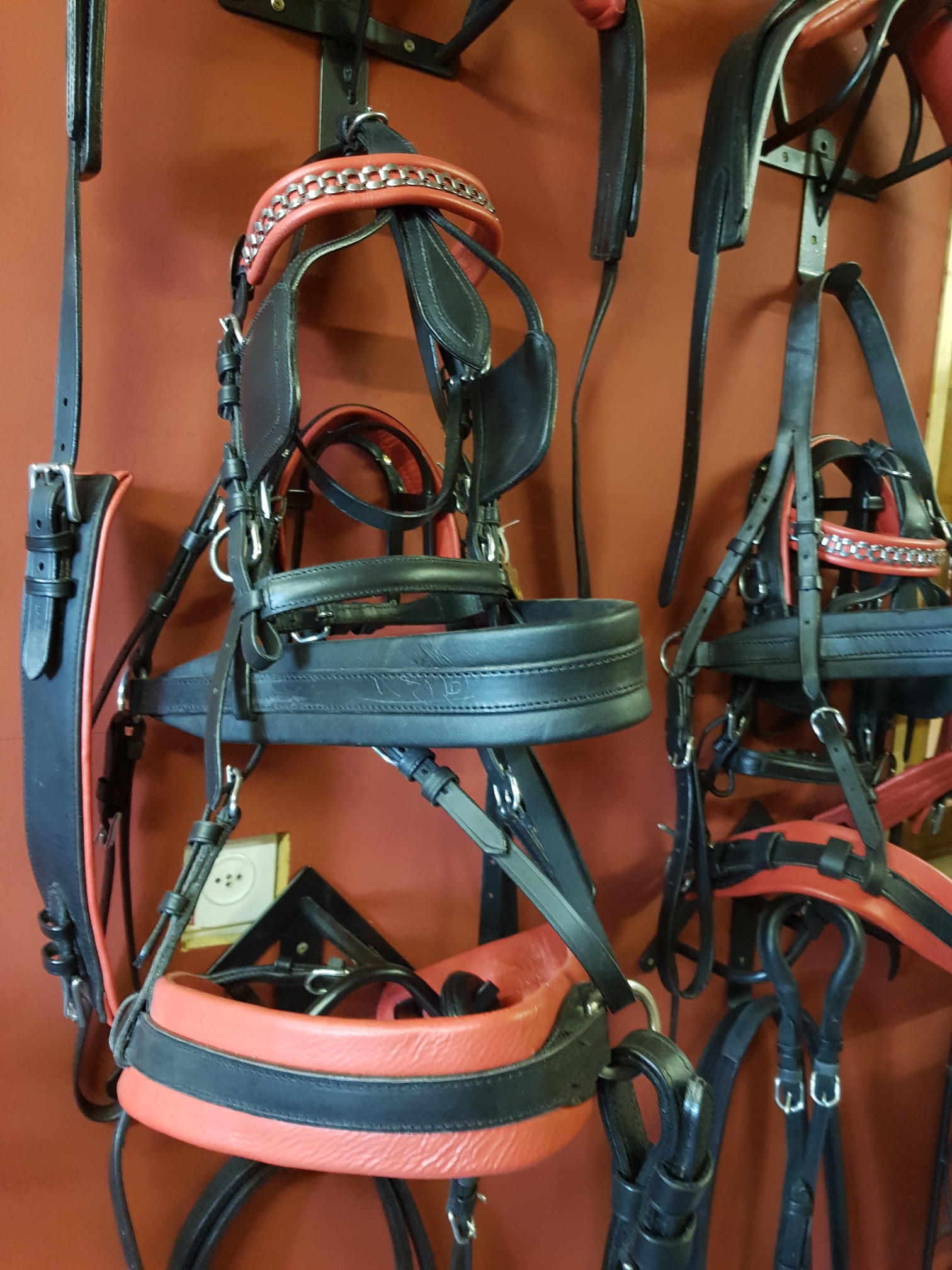 komplettes zweispännergeschirr aus schwarzem leder, rot unterlegt